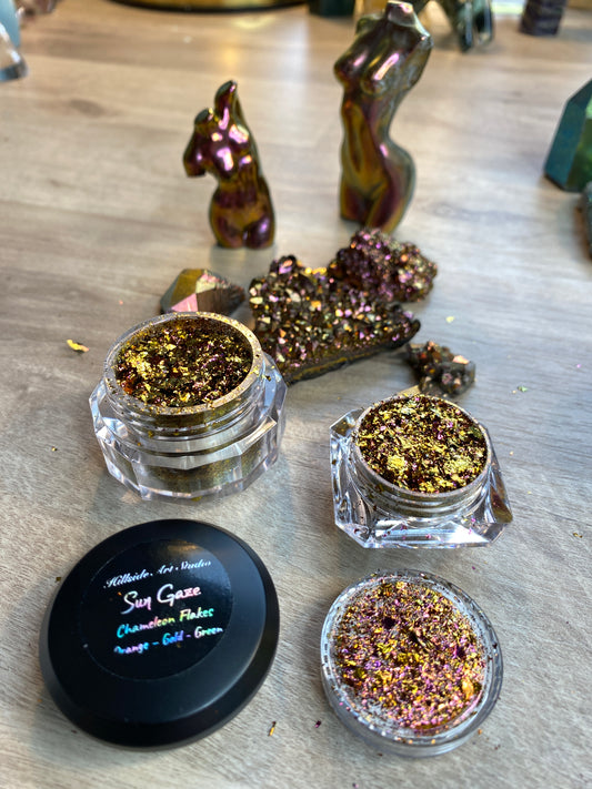 'Sun Gaze' Chameleon Colour Shifting Flakes. Lilac - gold - green. 0.65g, 0.4g, 0.1g. Skin Safe, Resin Art, Nail Art