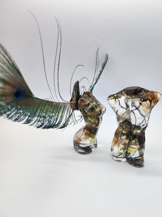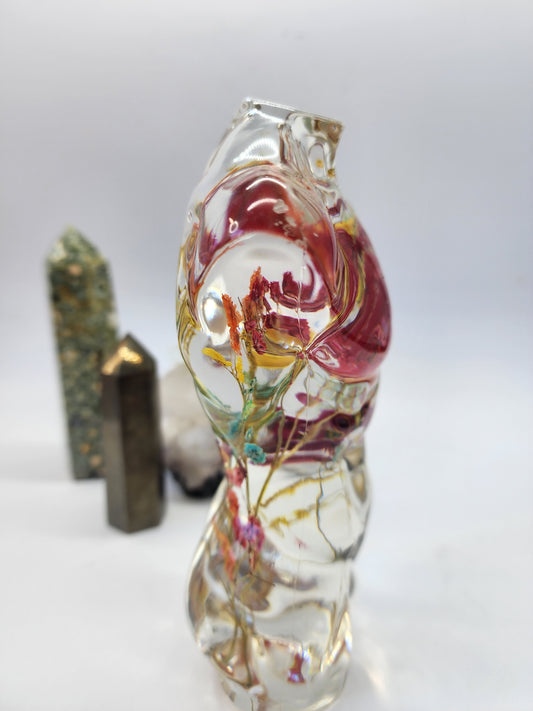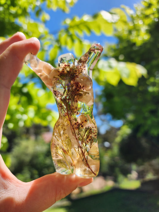 Pastel tone botanical and rose quartz and sunstone moonstone premade resin goddess.