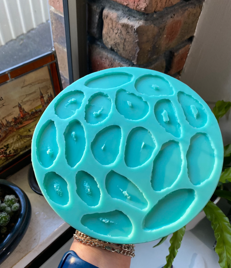 Silicone mould of 9 pairs of different agate slice shapes. 18 individual pieces.